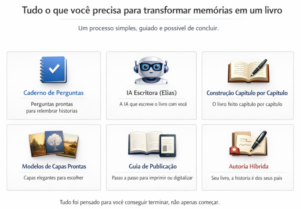 O “Elias” é uma IA que transformar as respostas das perguntas do “caderno de perguntas” em capítulos do seu livro.